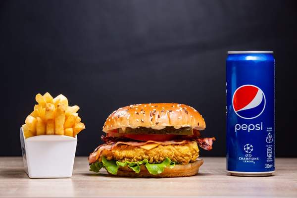 Bacon, fillet de pui, branza, crema de branza, salata, maioneza, bbq, chifla, cartofi, Pepsi
